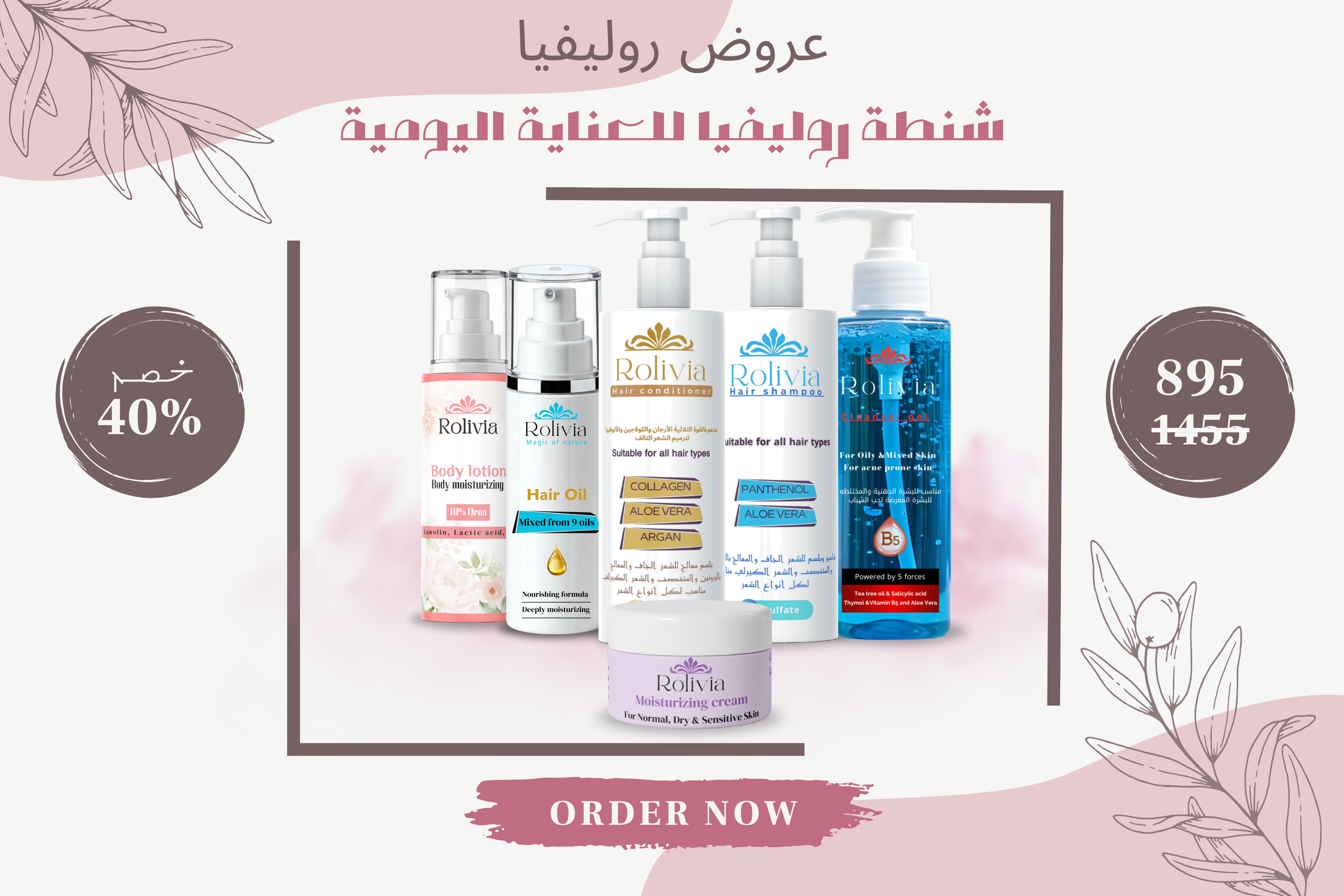 شنطة روليفيا غسول الوجه + شامبو خالي من السالفات + لوشن مرطب للجسم + كريم مرطب للبشرة + ميكس زيوت روليفيا لتصفيف الشعر + حمام كريم روليفيا